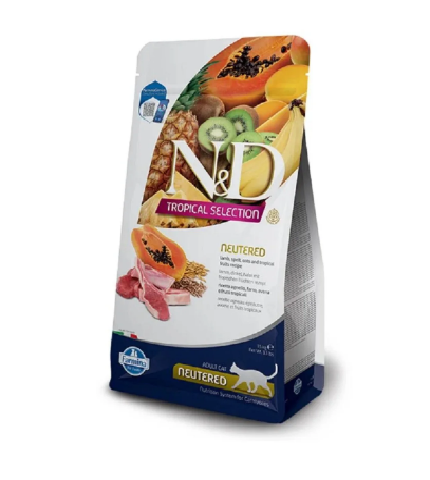 Nd tropical selection kuzu etli kısırlaştırılmış kedi maması; Kısırlaştırılmış kedilerin sağlığı için özel olarak formüle edilmiştir. ND Tropical serisi; Farmina tarafından üretilmiştir. Kısırlaştırılmış kedi maması, protein bakımından zengin kuzu eti içermektedir. Yer alan tropikal meyveler sayesinde güçlü antioksidan özelliğine sahiptir. Kedi maması; Vitamin bakımından zengin içeriğinden dolayı kedilerinizin bağışıklığının güçlenmesine destek vermektedir. Kısırlaştırma işlemi sonrası kilo almaya yatkın olan kediler için uygundur.