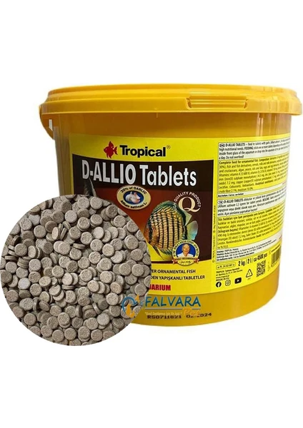 Tropical D-Allio Plus Tablet, sarımsaklı (% 30) çok bileşenli yavaş batan tablet formunda balık yemi.Yumuşak yapısı sayesinde kolay bir şekilde sindirilebilir. Discus türleri gibi tatlı su balıkları ve tuzlu su balıkları da dahil olmak üzere çoğu akvaryum balığı için günlük besleme yemidir.